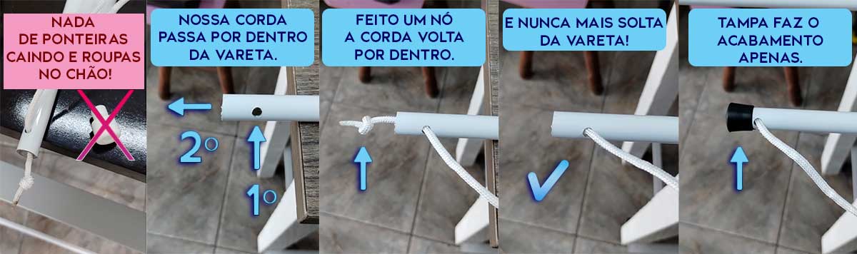 Uma das principais vantagens do nosso modelo de varal individual é que a corda passa por dentro da vareta, nada de ponteira caindo e